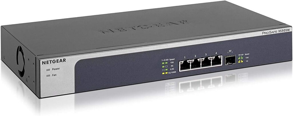 Il NETGEAR XS505M è uno switch multi-gigabit progettato per offrire prestazioni 10GbE complete in un formato compatto e semplice da utilizzare. È una soluzione ideale per chi vuole eliminare i limiti della rete Gigabit tradizionale e sfruttare appieno la velocità di NAS, workstation e computer moderni.